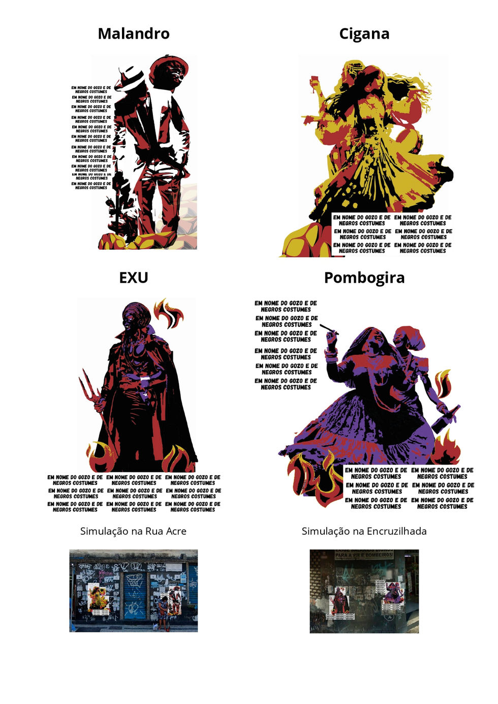 Série de 4 lambes com representações das entidades: Pombogira, Malandro, Cigana e Exu. Foram produzidas originalmente para o Edital 7 Línguas do Atêlie Terreiro em parceria com Sérgio Xavier e Daniel Franco. Aqui compartilho parte do processo criativo, proposta conceitual e projeção final.
